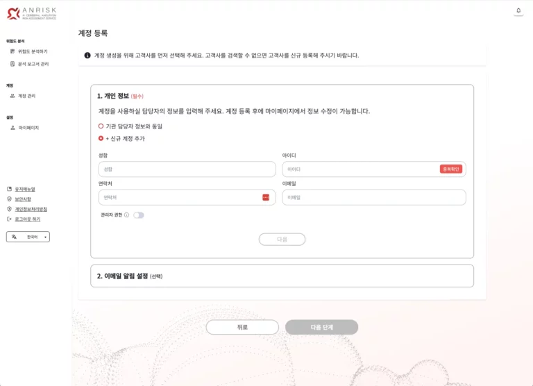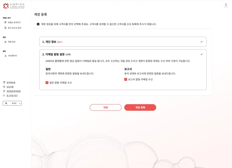 - 고객사를 사업자번호로 검색하고 선택한 후에 개인 정보와 이메일 알림 설정을 하고 아래 ‘계정 등록’ 버튼을 클리하면 등록이 완료됩니다.