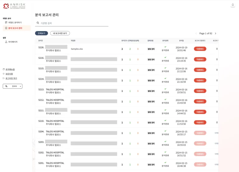- 분석이 완료되면 보고서는 ‘위험도 분석 내역’에서 다운로드 하실 수 있습니다.