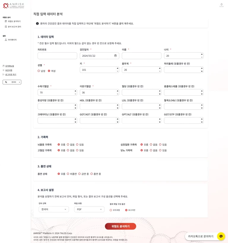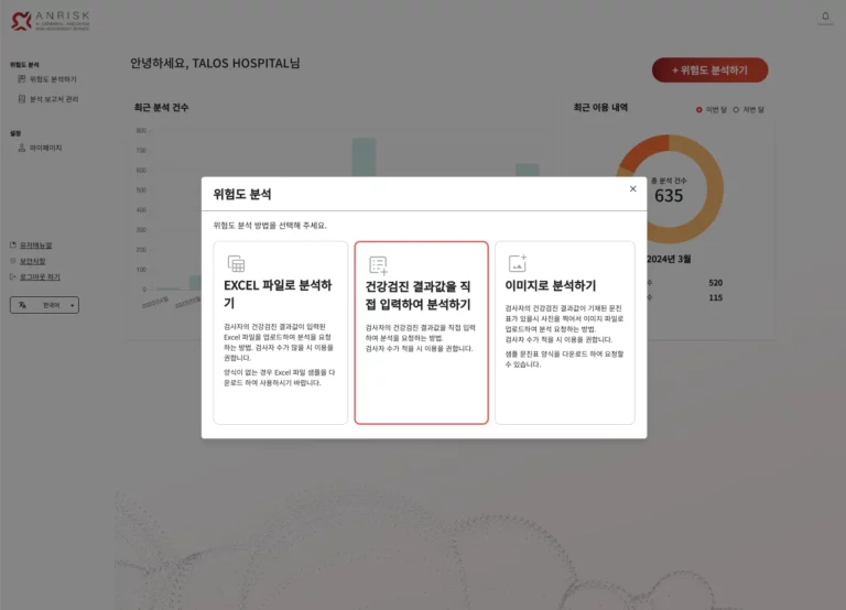 ANRISK®는 일반 건강검진 결과만으로 뇌동맥류 발생 위험도를 평가하는 인공지능 (AI) 알고리즘 기반 플랫폼입니다. 고성능 인공지능(AI)을 통해 누구나 합리적인 비용으로 안전하게 뇌동맥류 위험도를 측정하고 확인할 수 있습니다. 이 분석은 건강검진 데이터를 기반으로 진행되며, 산출된 위험도 점수에 따라 총 5단계로 분류하여 결과를 제공합니다.
