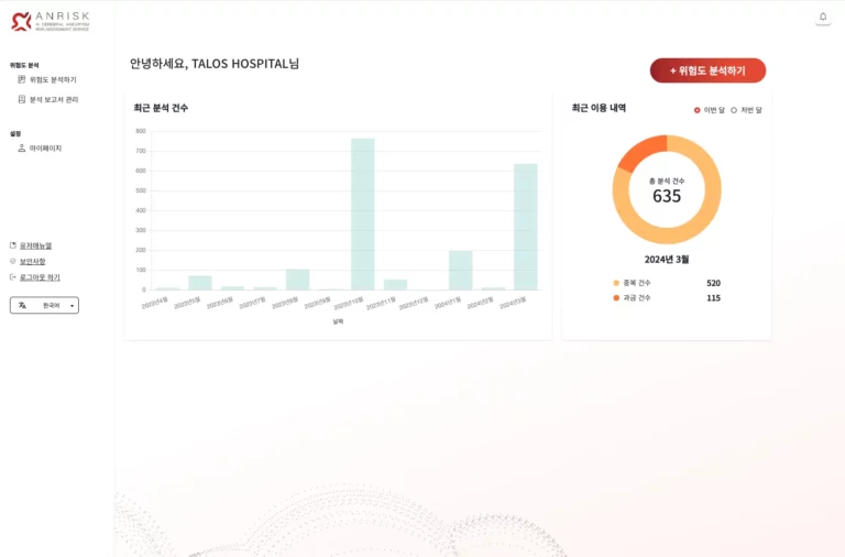 Dashboard(홈)을 통해 최근 1년의 분석 건수 통계와 바로가기 링크를 제공합니다. 위험도 분석을 하시려면 오른쪽 상단에 있는 버튼을 눌러주세요. 플랫폼의 다국어를 지원하고 있으며 좌측 하단에 언어 선택을 하셔서 플랫폼 사용이 가능합니다.