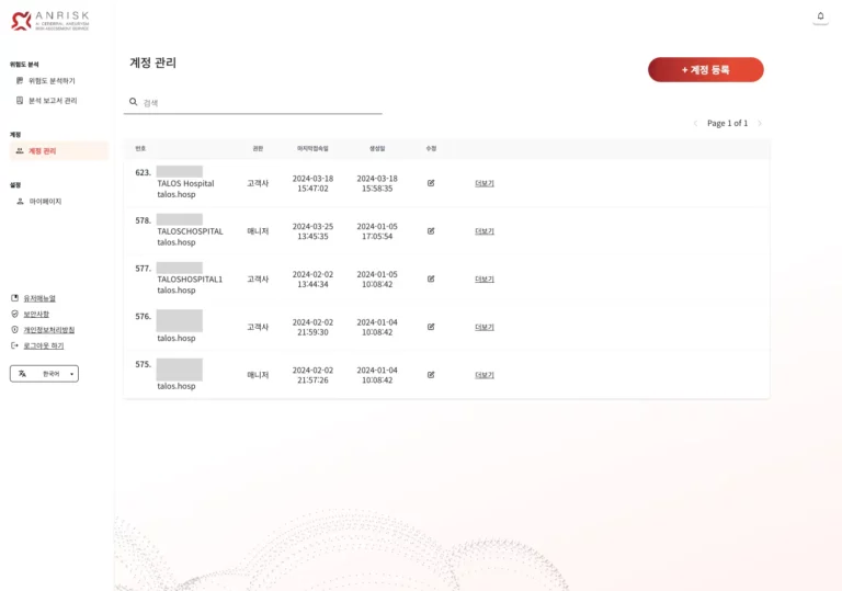 매니저 권한이 있는 계정은 추가적으로 신규 계정을 등록할 수 있습니다. ‘계정 관리’ 페이지에 들어가시고 우측 상단에 있는 버튼을 클릭하여 계정을 등록해 주세요.