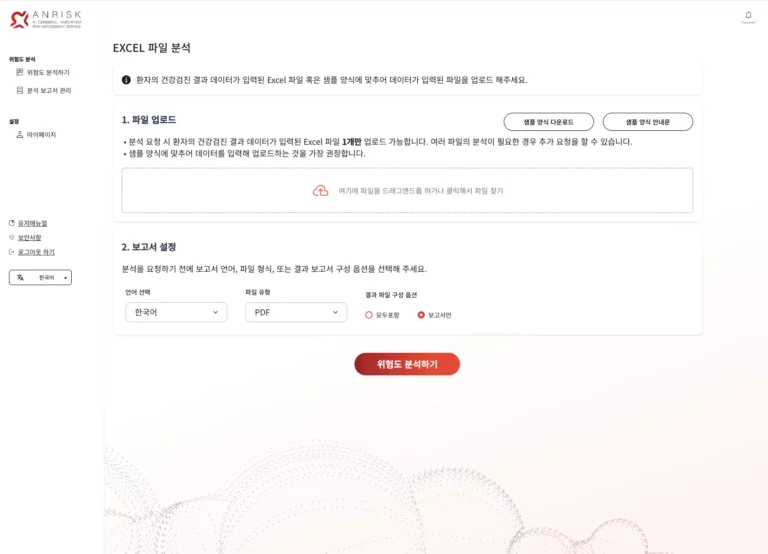 - 보고서 설정에 언어 설정, 파일 유형, 그리고 결과 파일 구성 옵션을 선택해주세요. 모두포함된 결과 파일 구성은 분석 보고서, 기존 분석 Excel 파일, 그리고 분석 결과 Excel 파일입니다.