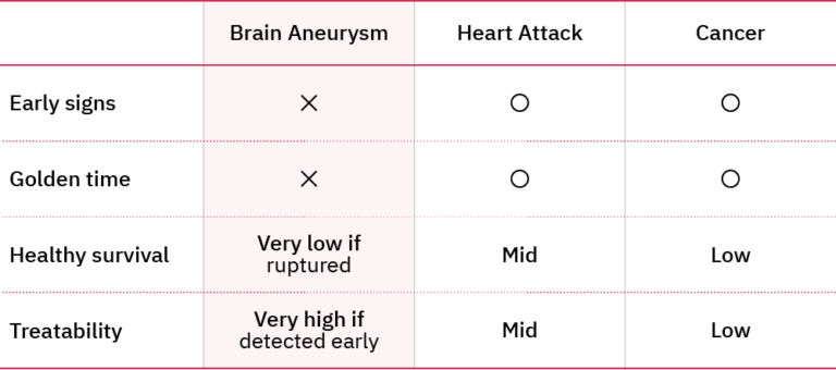 Unlike many other serious diseases, brain aneurysms often show no symptoms or warning signs that suggest the need for treatment. While other conditions are regularly screened for, brain aneurysms are frequently overlooked.