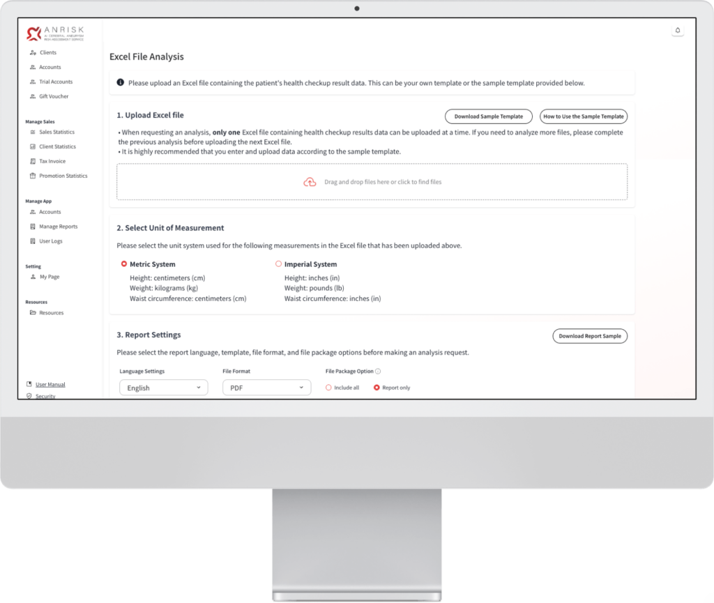 Analyze the risk of brain aneurysms for small or large-scale groups. Upload the data points from a standard health screening exam, request the analysis, and immediately download personalized reports for each examinee.