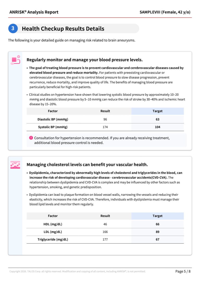 Once the analysis has been completed, a report is generated for each examinee. The report provides a highly personalized and in-depth analysis of how each parameter significantly impacts the risk level, as well as a detailed guide to lowering the risk level.