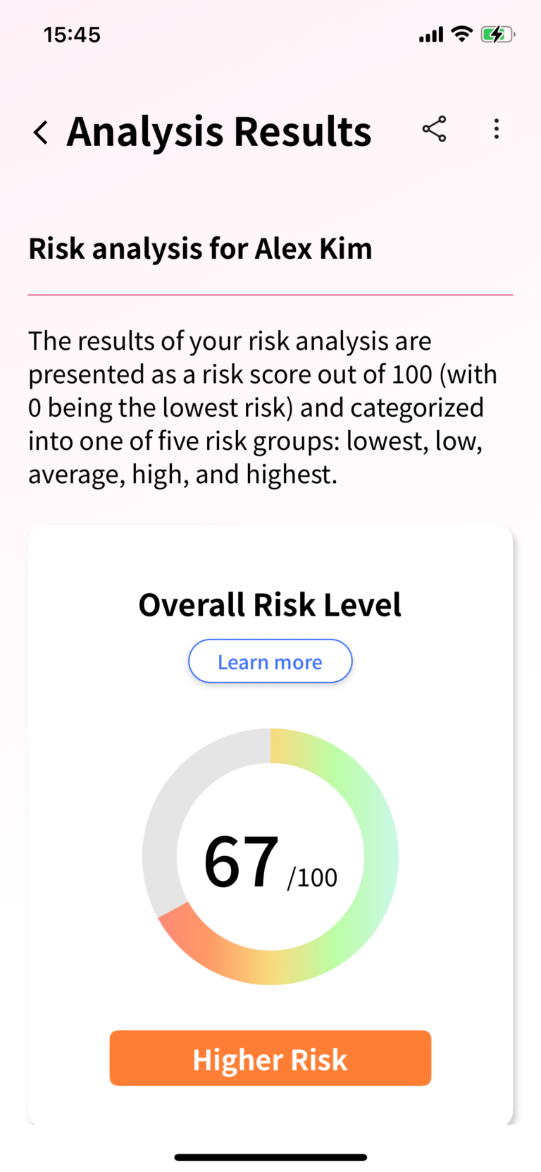 결과를 불러오고 간단한 가족력 설문만 완료하면 분석을 요청할 수 있습니다.